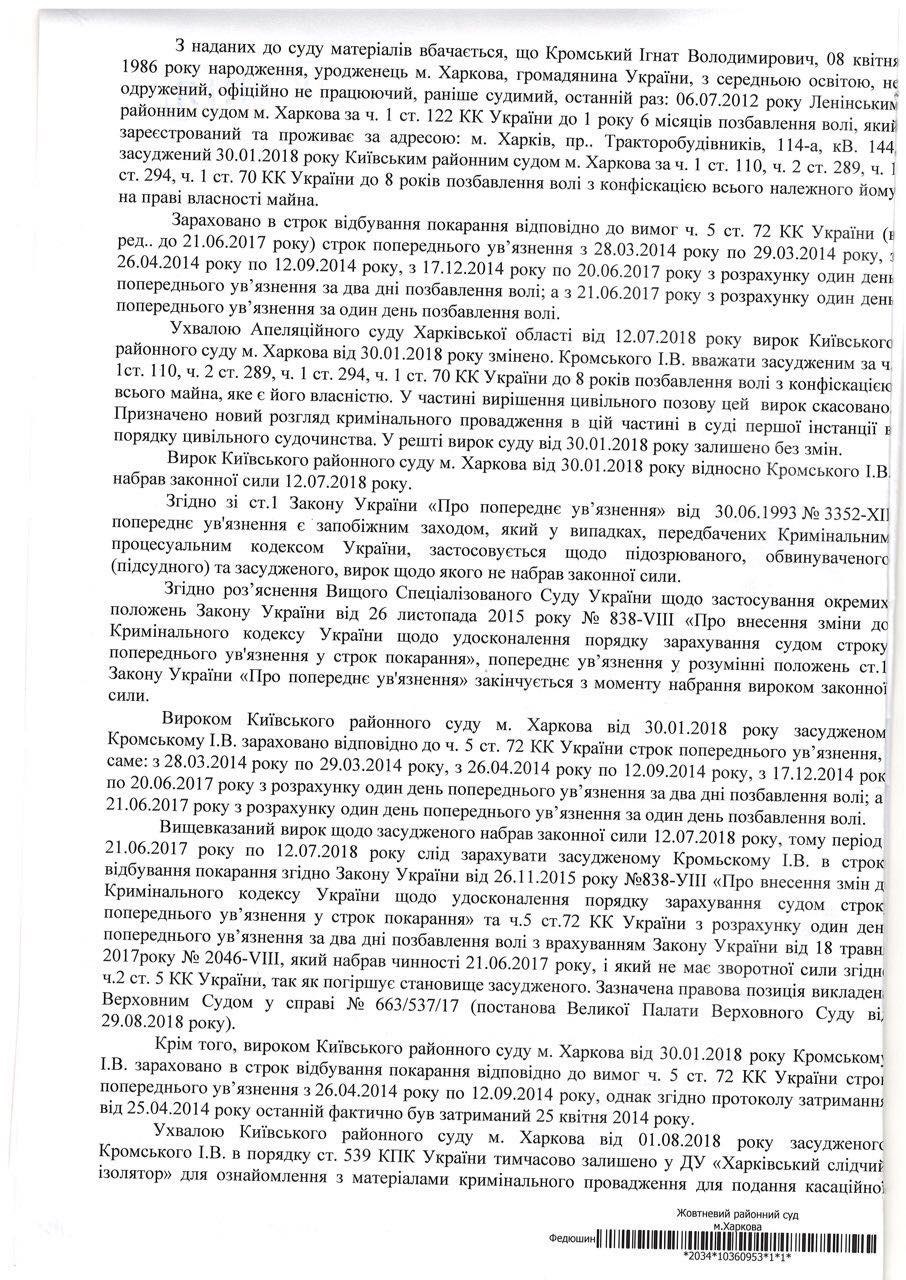 Кромской был задержан 28 марта 2014 года в рамках уголовного производства, открытого по факту штурма Харьковской облгосадминистрации 1 марта.