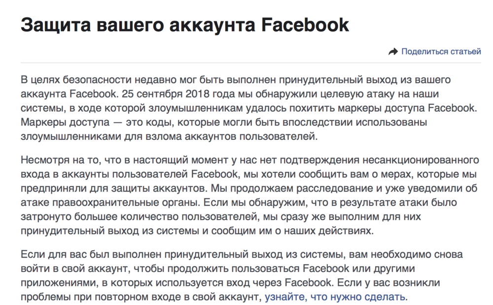 Facebook предупреждает, что число потенциальных пострадавших может возрасти и что компания продолжает тщательное расследование этого инцидента.