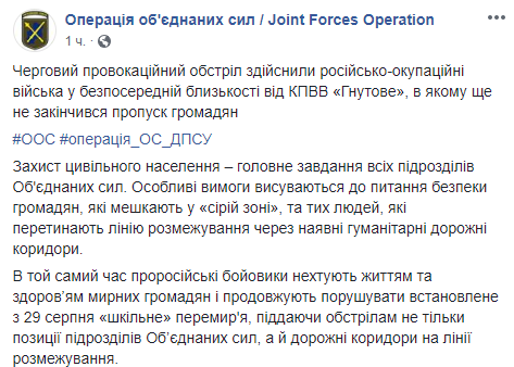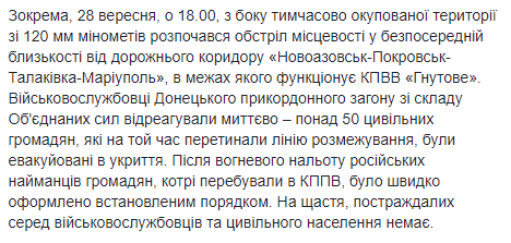 "28 сентября, в 18.00, со стороны временно оккупированной территории со 120 мм минометов начался обстрел местности в непосредственной близости от дорожного коридора "Новоазовск-Покровск-Талаковка-Мариуполь", в рамках которого функционирует КПВВ "Гнутово", - сказано в сообщении.