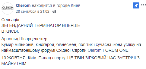 "Сенсация. Легендарный Терминатор впервые в Киеве. Кумир миллионов, киногерой, бизнесмен, политик и современная икона успеха на масштабном форуме Восточной Европы Olerom FORUM ONE", - сказано в сообщении.