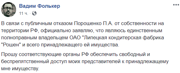 "В связи с публичным отказом Порошенко П.А. от собственности на территории РФ официально заявляю, что являюсь единственным полноправным владельцем ОАО "Липецкая кондитерская фабрика "Рошен" и всего принадлежащего ей имущества.