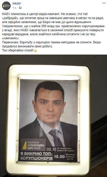 "НАБУ оказалось в центре медиакампании. Мы не знаем, кто этот "добродетель", уплативший деньги за наружную рекламу в метро и на радио, но официально заявляем, что Бюро не имеет к этому отношения.