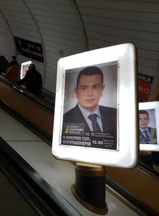 1 октября в киевском метрополитене появились ситилайты с изображение главы Национального антикоррупционного бюро (НАБУ) Артема Сытника с анонсом заседания комитета Верховной Рады по вопросам предотвращения и противодействия коррупции, которое запланировано на 3 октября. Также на рекламных плакатах имеется надпись "Я разоблачу топ-коррупционеров".