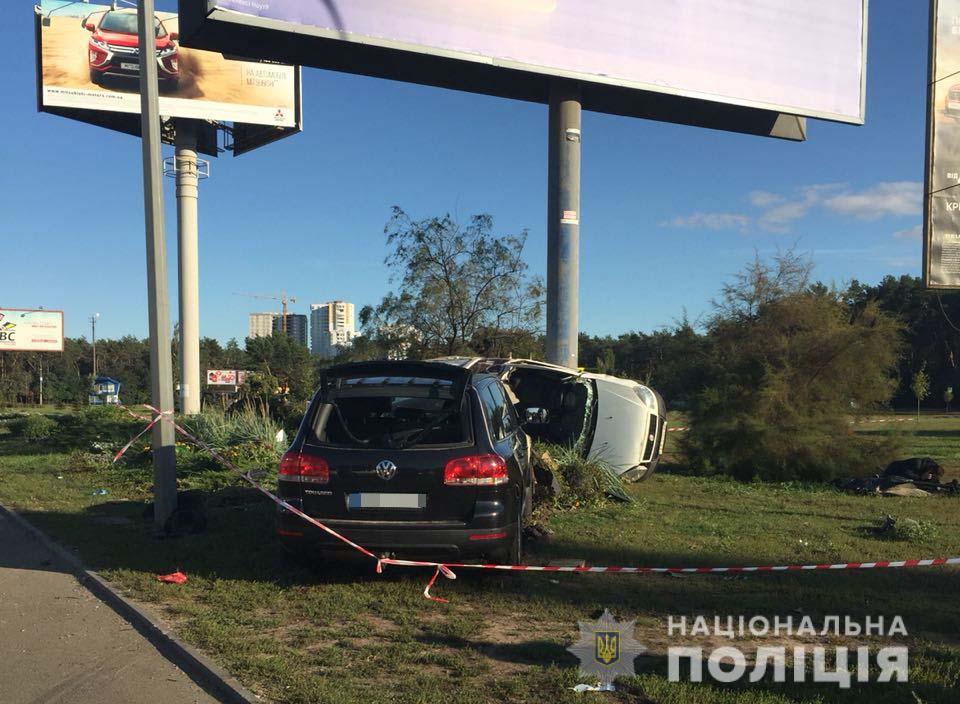 Следователи предварительно установили, что автомобиль Volkswagen Touareg двигался со стороны проспекта Бажана в направлении Бориспольского шоссе. Автомобиль выехал на круговой перекресток и совершил столкновение с автомобилем Fiat Doblo.