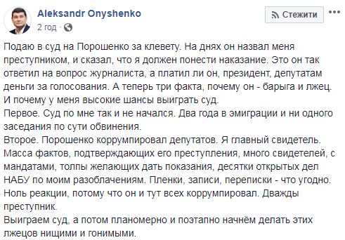 "Первое. Суд по мне так и не начался. Два года в эмиграции и ни одного заседания по сути обвинения.  Второе. Порошенко коррумпировал депутатов. Я главный свидетель. Масса фактов, подтверждающих его преступления, много свидетелей, с мандатами, толпы желающих дать показания, десятки открытых дел НАБУ по моим разоблачениям. Пленки, записи, переписки - что угодно. Ноль реакции, потому что он и тут всех коррумпировал. Дважды преступник", - написал Онищенко.
