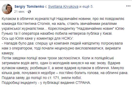 "Кулаком в лицо журналистке! Чрезвычайные новости, о которых сообщает команда Константина Стогния, к сожалению, становятся обычными реалиями украинской журналистики... Корреспондент "Надзвичайних новин" Юлию Гунько и ее оператора нагло избила нетрезвая публика в Киеве", - пишет он.