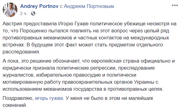 "Игорю Гужве дали политубежище в Австрии. Это означает, что теперь Игорь под защитой австрийских властей. Это означает, что он интегрируется в Европу. Это означает, что именно Европа признала украинское правосудие политангажированным.