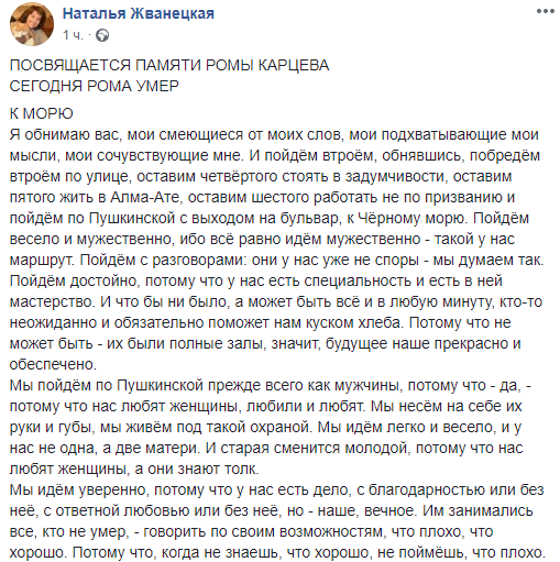 О смерти артиста первой написала супруга Михаила Жванецкого Наталья, обнародовав текст Жванецкого "К морю", посвященный памяти Романа Карцева.