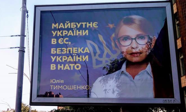 Юлия Тимошенко разместила несколько вариантов билбордов. На одном из них она копируется один из главных лозунгов Порошенко: "Будущее Украины в ЕС, безопасность Украины в НАТО".