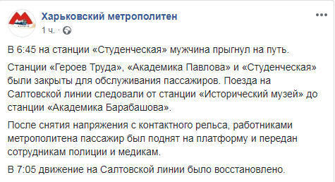 Сегодня, 3 октября, около 06:45 на Салтовской ветке метро Харькова мужчина упал на рельсы. Об этом пресс-служба Харьковского метрополитена сообщает на своей странице в Facebook.