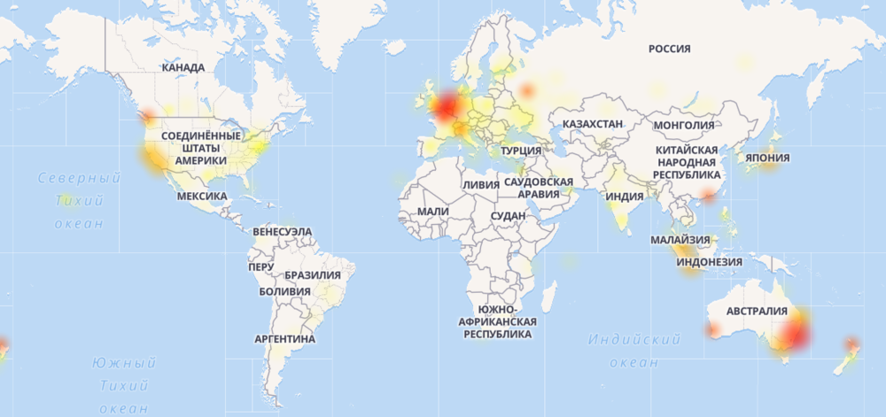 Судя по карте сбоев, проблемы ощутили пользователи в Европе, США, Австралии, Индонезии, Японии и России. Самая сложная ситуация в Великобритании и Нидерландах, в Украине также наблюдается сбой.