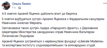 "Запланирована также встреча лидера "Народного фронта" с государственным секретарем Министерства иностранных дел Германии Вальтером Йоганнесом Линднером. Арсений Яценюк встретится с руководством учредительства "Liberale Moderne" и экспертами Института восточноевропейских и международных студий", - написала Ольга Лаппо в Facebook.