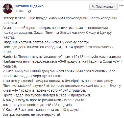 Завтра, 4 октября в Украине ожидается облачность и уже достаточная прохлада, днем +9+14 градусов. Но "если вы не перемерзнете, в выходные погода обещает быть просто роскошной". Об этом написала синоптик Наталья Диденко на своей странице в Facebook.