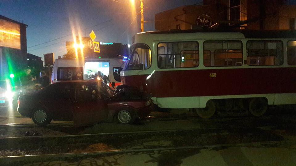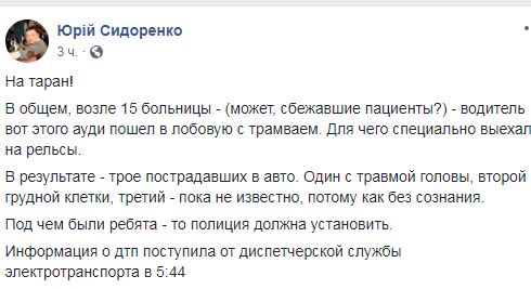 "Возле 15 больницы - (может, сбежавшие пациенты?) - водитель вот этого "Аudi" пошел в лобовую с трамваем. Для чего специально выехал на рельсы", - написал Сидоренко. Он добавил, что информация о ДТП поступила в 05:44 от диспетчерской службы электротранспорта.