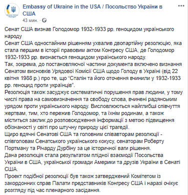 Сенат США единогласно принял двухпартийную резолюцию, которая стала первым в истории правовым актом Конгресса США, где Голодомор 1932-1933 гг признан геноцидом украинского народа. Об этом говорится в сообщении посольства Украины в США в соцсети.