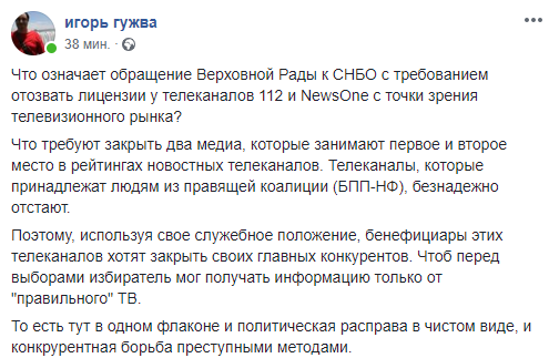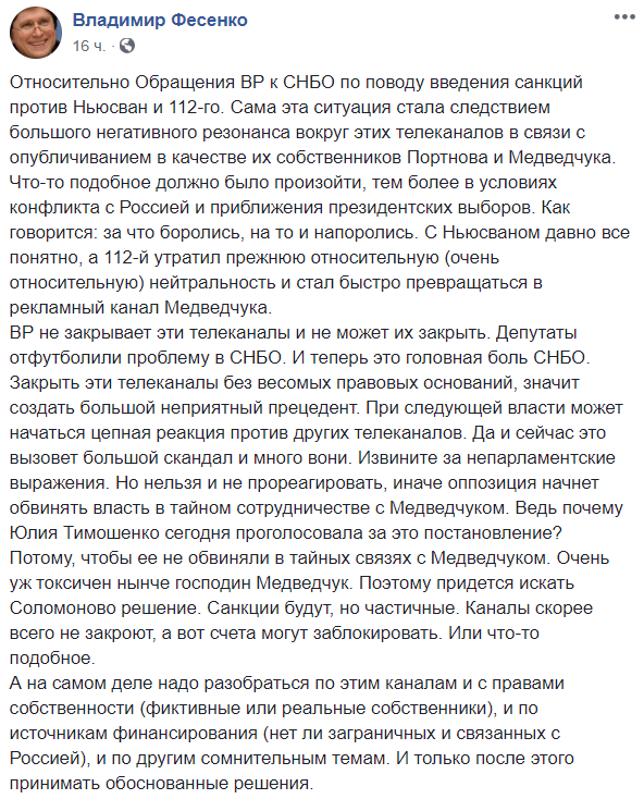 Я против закрытия каких-либо СМИ без решения суда и реальных доказательств ими нарушения законов. Но теперь мяч на стороне президента и СНБО, и я уверен, это будет еще одним сеансом снятия масок. Потому что мой прогноз: Совбез не примет никакого реального решения по этому вопросу",  - написал депутат в Facebook.
