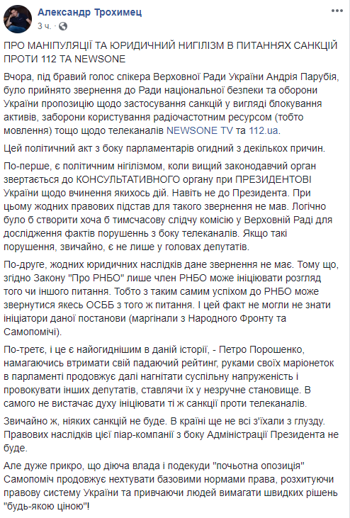 "Никаких юридических последствий данное обращение (Рады - ред.) не имеет. Потому что, согласно Закону "О СНБО" только член СНБО может инициировать рассмотрение того или иного вопроса. То есть с таким же успехом в СНБО может обратиться какое-нибудь ОСМД по тому же вопросу. И этот факт не могли не знать инициаторы данного постановления", - пишет в Facebook юрист Александр Трохимец.