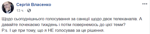 Об этом же заявил нардеп Сергей Власенко из "Батькивщины". "Относительно сегодняшнего голосования за санкции в отношении двух телеканалов. А давайте подождем неделю и затем вернемся к этой теме?