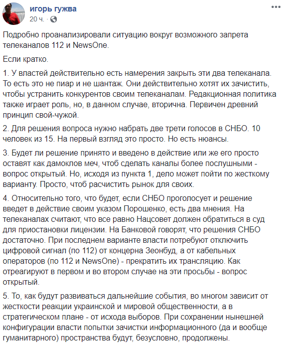 "1. У властей действительно есть намерения закрыть эти два телеканала. То есть это не пиар и не шантаж. Они действительно хотят их зачистить, чтобы устранить конкурентов своим телеканалам. Редакционная политика также играет роль, но, в данном случае, вторична. Первичен древний принцип свой-чужой.