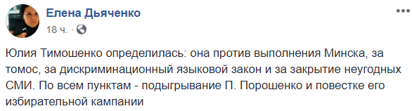 "Юлия Тимошенко определилась: она против выполнения Минска, за томос, за дискриминационный языковой закон и за закрытие неугодных СМИ. По всем пунктам - подыгрывание П. Порошенко и повестке его избирательной кампании", - вторит маркетолог Елена Дьяченко.