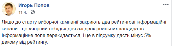 "Если до старта избирательной кампании закроют два рейтинговых информационных канала - это "черный лебедь" для сразу двух реальных кандидатов. Информационное поле опрокидывается, и это в итоге даст минус 5% для некоторых от рейтинга", - предрекает нардеп Игорь Попов.