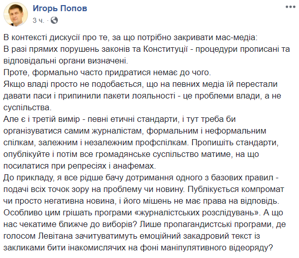 К примеру, я все реже вижу соблюдение одного из базовых правил - подачи всех точек зрения на проблему или новость. Публикуется компромат или просто негативная новость, и его мишень не имеет права на ответ. Особенно этим грешат программы "журналистских расследований". А что нас ждет ближе к выборам? Только пропагандистские программы, где голосом Левитана будут зачитывать эмоциональный закадровый текст с призывами бить инакомыслящих на фоне манипулятивного видеоряда?", - задается вопросом нардеп Попов.