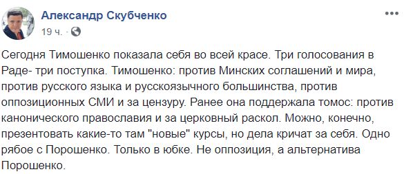 "Сегодня Тимошенко показала себя во всей красе. Три голосования в Раде- три поступка. Тимошенко: против Минских соглашений и мира, против русского языка и русскоязычного большинства, против оппозиционных СМИ и за цензуру. Ранее она поддержала томос: против канонического православия и за церковный раскол. Можно, конечно, презентовать какие-то там "новые" курсы, но дела кричат за себя. Одно рябое с Порошенко. Только в юбке. Не оппозиция, а альтернатива Порошенко", - уверен блогер Александр Скубченко.