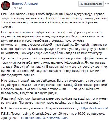 Напомним, Валерия Ананьева задержали 10 сентября во Днепре перед презентацией его книги. Задержание объясняли необходимостью проведения следственных действий по делу об умышленном телесном повреждении (перелом носа), которое блогер нанес знакомому два года назад. По данным правоохранителей, Ананьев не явился по повестке в полицию и его объявили в розыск.