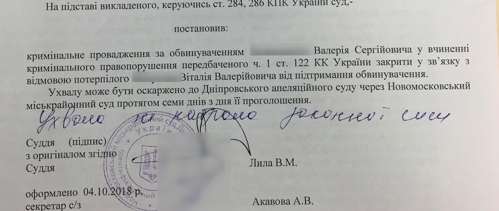 Юрист Маси Найем также написал, что Новомосковский городской суд Днепропетровской области закрыл дело против Ананьева "в связи с отказом потерпевшего от поддержания обвинения".