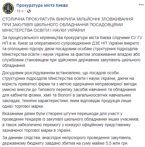 Чиновники из Министерства образования и науки совершили миллионные махинации при закупке школьного оборудования. Об этом сообщили в прокуратуре Киева.