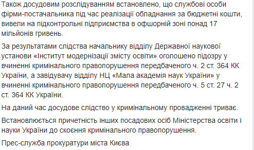 В прокуратуре отметили, что из-за нарушений тендера госбюджету нанесли ущерб почти на 5,5 млн гривен. Также должностные лица фирмы-поставщика при реализации оборудования за бюджетные средства, вывели на подконтрольные предприятия в оффшорной зоне более 17 млн гривен.