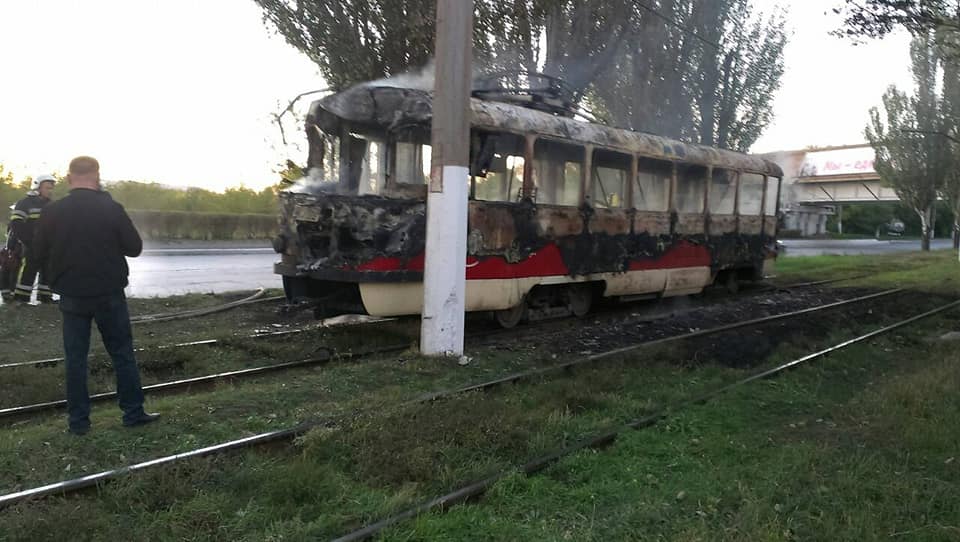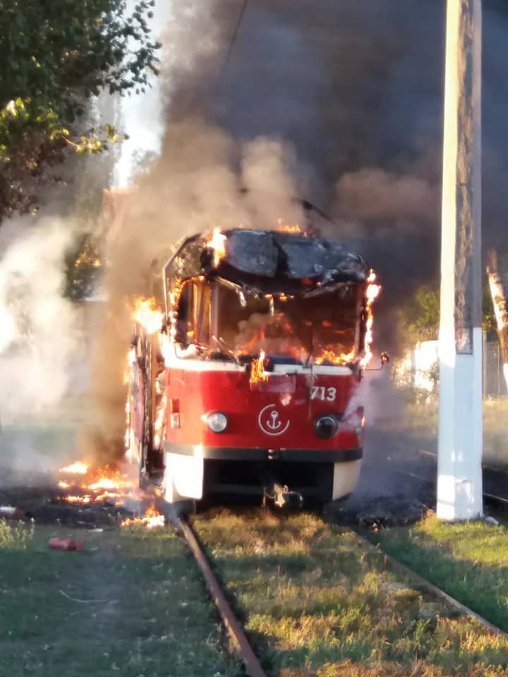 Факел на колесах. В Мариуполе на ходу ярко вспыхнул и сгорел трамвай. Фото и видео