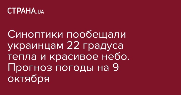 9 октября Украина будет оставаться во власти антициклона, благодаря этому по всей территории страны сохранится сухая и солнечная погода. Об этом сообщила синоптик Наталья Диденко на своей странице в Facebook.