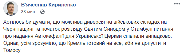 12:59  Среди версий появляются и очень уж экзотические. Вице-премьер Вячеслав Кириленко считает, что взрывы в Ичне организованы для того, чтобы сорвать предоставление Томоса об автокефалии.