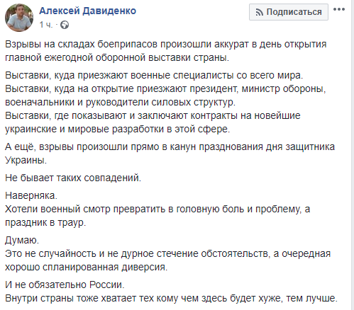 "Сватово – Балаклея – Калиновка – Ичня. Разумеется, скорее всего, это очередная диверсия РФ, которая централизованно уничтожает запасы наших боеприпасов... Сейчас, конечно, опять пойдут слухи о ревизиях, что, мол, сами воруют и подрывают. Но все это чушь. Во-первых, ворам взрывать склады не стоит, они никаких ревизий не боятся, им склады, наоборот, целые нужны, наши старые боеприпасы никто не стремится уже похищать, они уже все давно превысили предельные сроки хранения и нуждаются в проверке и переснаряжении. Во-вторых, никаких следов продажи фрагментов боеприпасов или целых боеприпасов нет, а если бы что-то кто-то хотел украсть после Балаклеи и Калиновки то уже давно бы засветились эти предметы. Так что это диверсия – это, как обычно, неприятно слышать тем, кто отвечает за наземную охрану и за ПВО от беспилотников, но это диверсия.