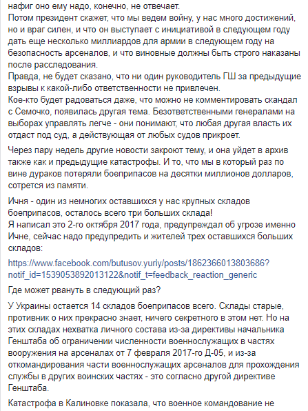 Потом Генштаб напишет, что все начальники действуют прекрасно, все было в образцовом порядке, причем охрана тоже, но полиция плохо охраняет территорию вокруг складов, там могут быть проблемы. Затем все порохоботы начнут писать, что Муженко не виноват, да разве может начальник Генштаба отвечать за какой-то склад? Да, конечно, нафиг оно ему надо, конечно, не отвечает.