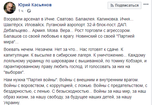 "Взорвали арсенал в Ичне. Сватово. Балаклея. Калиновка. Ичня... Шахтерск. Иловайск. Луганский аэропорт. 32-й блокпост. ДАП. Дебальцево... Армия. Мова. Вера... Рост торговли с агрессором. Балашов со своей любовью к врагу. Новинский со своей "Партией мира"...