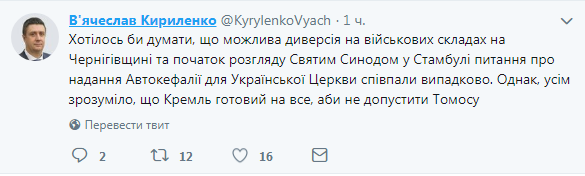 "Хотелось бы думать, что возможная диверсия на военных складах на Черниговщине и начало рассмотрения святым синодом в Стамбуле вопроса о предоставлении автокефалии для Украинской церкви совпали случайно. Однако, всем понятно, что Кремль готов на все, чтобы не допустить Томоса", - написал Кириленко.
