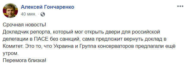 "Докладчик репорта, который мог открыть двери для российской делегации в ПАСЕ без санкций, сама предложит вернуть доклад в Комитет. Это то, что Украина и Группа консерваторов предлагали ещё утром. Перемога близка!", - написал нардеп в Facebook.