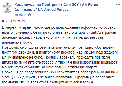 В командовании ВВС Украины опровергают распространенную в Интернете информацию, что беспилотный летательный аппарат в районе арсенала над Ичней мог стать причиной взрыва.