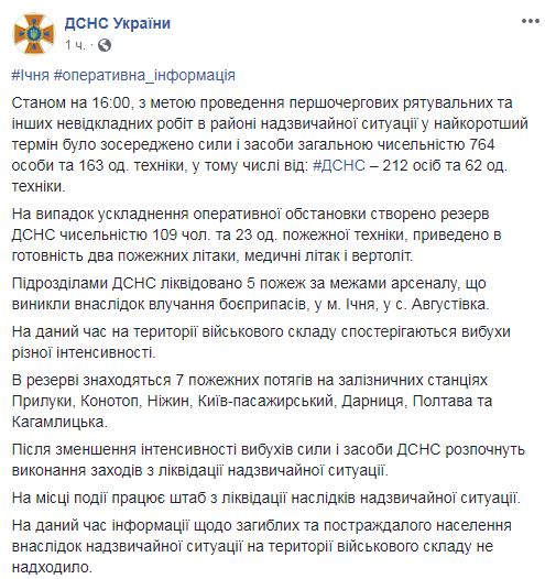 На месте происшествия сосредоточены силы и средства общей численностью 764 человека и 163 единицы техники. На случай осложнения оперативной обстановки создали резерв численностью 109 человек и 23 единицы пожарной техники. Кроме этого, приведены в готовность два пожарных самолета, медицинские самолет и вертолет и в резерве на железнодорожных станциях Прилуки, Конотоп, Нежин, Киев-пассажирский, Дарница, Полтава и Кагамлыцкая находятся 7 пожарных поездов.