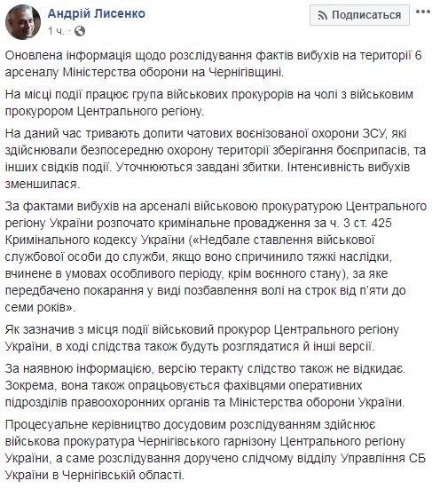 Взрывы снарядов на арсенале возле Ични в Черниговской области могут быть терактом. Об этом на своей странице в социальной сети Facebook сообщил спикер Генпрокуратуры Андрей Лысенко.