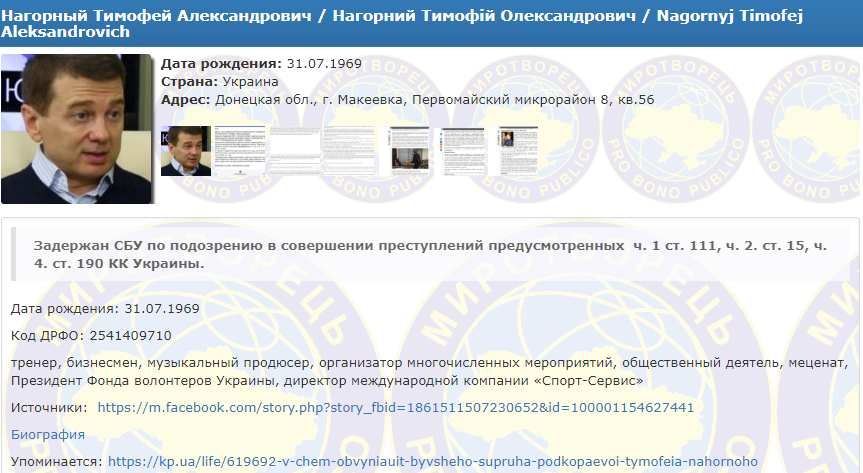 Украинский бизнесмен, меценат, общественный деятель, продюсер и экс-супруг гимнастки Лилии Подкопаевой Тимофей Нагорный, который находится в следственном изоляторе, занесен в базу "Миротворца". Об этом сообщается на сайте организации.