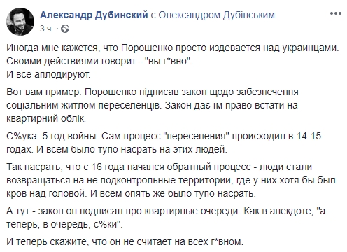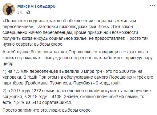 Общественный деятель Максим Гольдарб приводит данные по выделению сребств на социальное жилье: "Порошенко подписал закон об обеспечении социальным жильем переселенцев", - заголовки лизоблюдских сми. Ложь. Этот закон совершенно ничего переселенцам, кроме призрачной возможности получить когда-нибудь социальное жильё, не предоставляет. Просто так нужно соврать: выборы скоро.