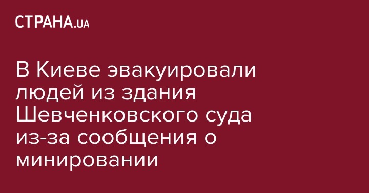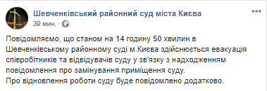 "Сообщаем, что по состоянию на 14 часов 50 минут в Шевченковском районном суде Киева осуществляется эвакуация сотрудников и посетителей суда в связи с поступлением сообщения о заминировании здания суда", - говорится в сообщении.