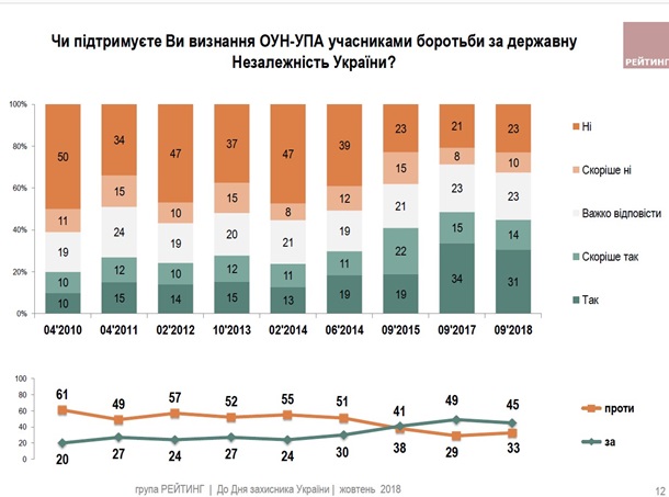 При этом за последний год число сторонников признания ОУН-УПА уменьшилось на 4 процента, а противников на столько же увеличилось.