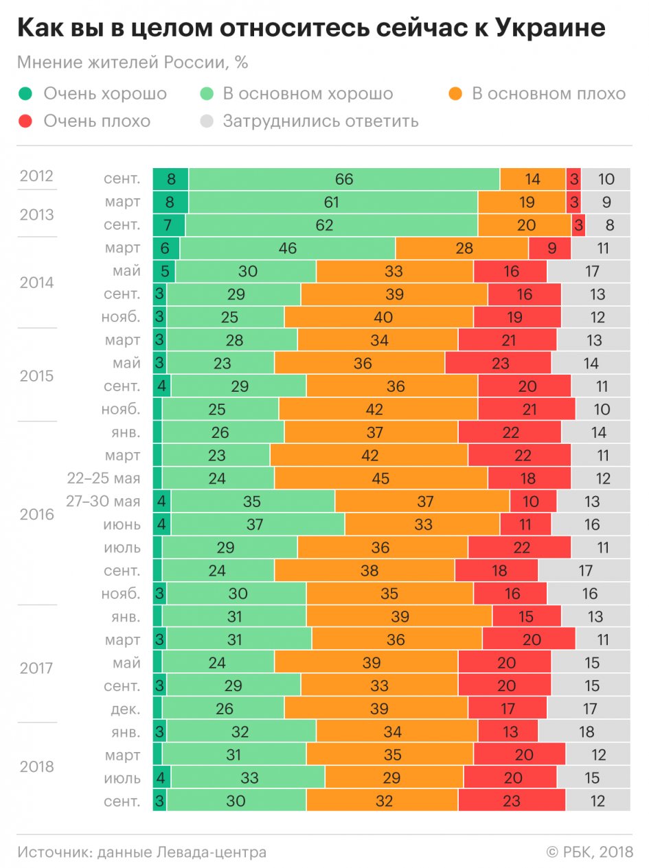 Отношение россиян к Украине, по данным социологов, существенно не изменилось. В сентябре 33% российских респондентов сообщили, что положительно относятся к соседней стране. Это на 1% выше аналогичного показателя в сентябре 2017 года. 30% сказали, что относятся к соседу "в основном хорошо", еще 3% - "очень хорошо".
