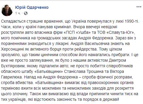 По словам Одарченко, его помощник получил ранение, он находится в больнице. "Андрея Васильевича знают на Херсонщине как активного борца против рейдерства. Поэтому вполне понятно, что таким циничным способом его пытались убрать. Это попытка физической расправы, попытка убийства", - написал он.