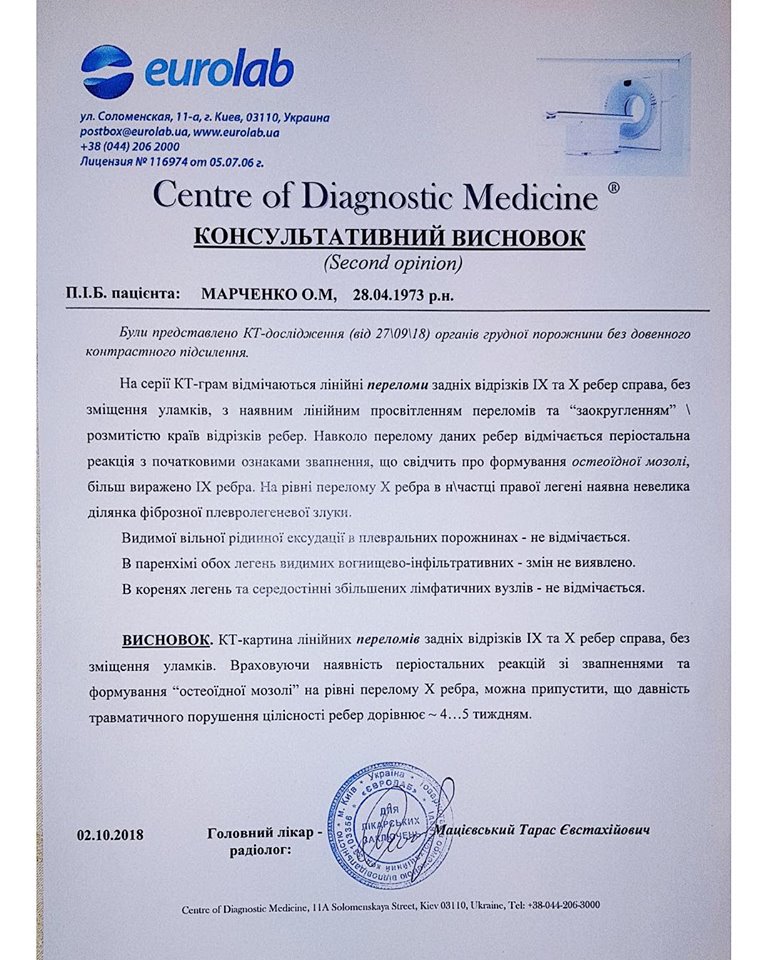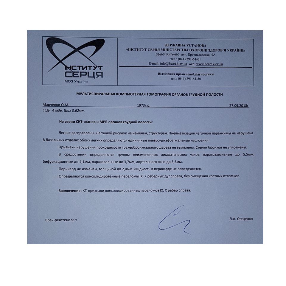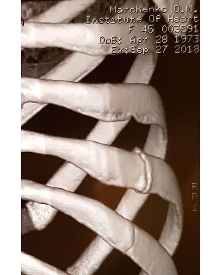 К посту Оксана Марченко приложила флюорографию ребер и медицинские справки, подтверждающие перелом двух ребер. А также фото с Дмитрием Чаплиным.