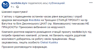 "В связи с повышением в последнее время уровня вандализма и попыток краж велосипедов Nextbike на Троещине станции проката на пр. Ватутина и возле Деснянского ЦПАУ (пр. Маяковского) временно не работают. Приносим извинения за неудобства", - говорится в сообщении.
